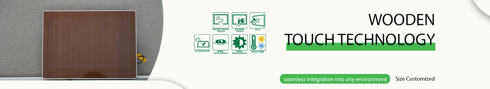 Holz-Touchscreens nutzen hochauflösende Bild- und Drucktechniken, um eine optisch ansprechende Holzstruktur auf der Bildschirmoberfläche zu erzeugen. Die Technologie soll das Aussehen verschiedener Holzarten simulieren und so den Touchscreen optisch mit Holzoberflächen in Innenräumen verschmelzen lassen.