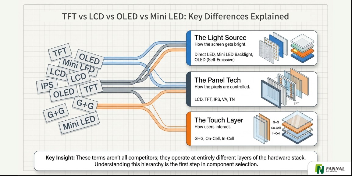 In der Display-Branche werden Begriffe wie TFT, LCD, IPS, OLED und Mini-LED oft synonym verwendet – tatsächlich gehören sie jedoch zu unterschiedlichen Schichten des Technologie-Stacks.